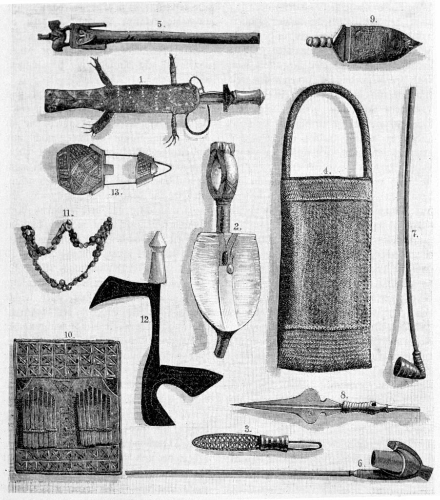 axes, as well as leather and basketry shields.