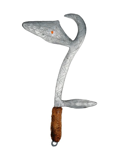 his mask) holds a musélé knife, in the shape of a hornbill head,